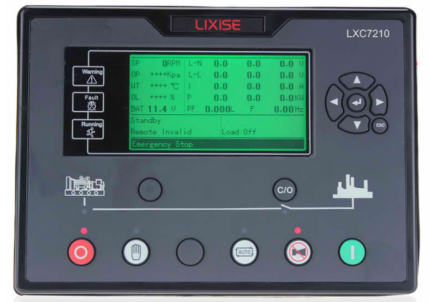 LXC7210 diesel genset automation controller series for a single automation and control systems, the use of 32-bit microprocessors and embedded real-time systems technology, turbine automatic start / stop, a variety of parameters precision measurement, alarm protection and "three remote "function. The controller uses LCD screen (240 * 128LCD) graphic display can be displayed on one page under almost all the important parameters, save the page. Can be set to Chinese, English, Spanish, Russian, all parameters can be adjusted from the control panel, or use a PC via USB, RS485 or GPRS remote adjustment and monitoring. Its compact, simple wiring, high reliability, and can be widely used in various types of generators automation systems, but also for fire pumps, air compressor automation control systems.