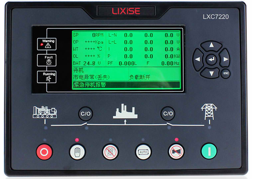 LXC7220 plant automation controller series diesel generator sets for a single automation and control systems, the use of 32-bit microprocessors and embedded real-time systems technology, turbine automatic start / stop, a variety of parameters precision measurement, alarm protection and "three remote "function. The controller uses LCD screen (240 * 128LCD) graphic display can be displayed on one page under almost all the important parameters, save the page. Can be set to Chinese, English, Spanish, Russian, all parameters can be adjusted from the control panel, or use a PC via USB, RS485 or GPRS remote adjustment and monitoring. Its compact, simple wiring, high reliability, and can be widely used in various types of generators automation systems, but also for fire pumps, air compressor automation control systems.